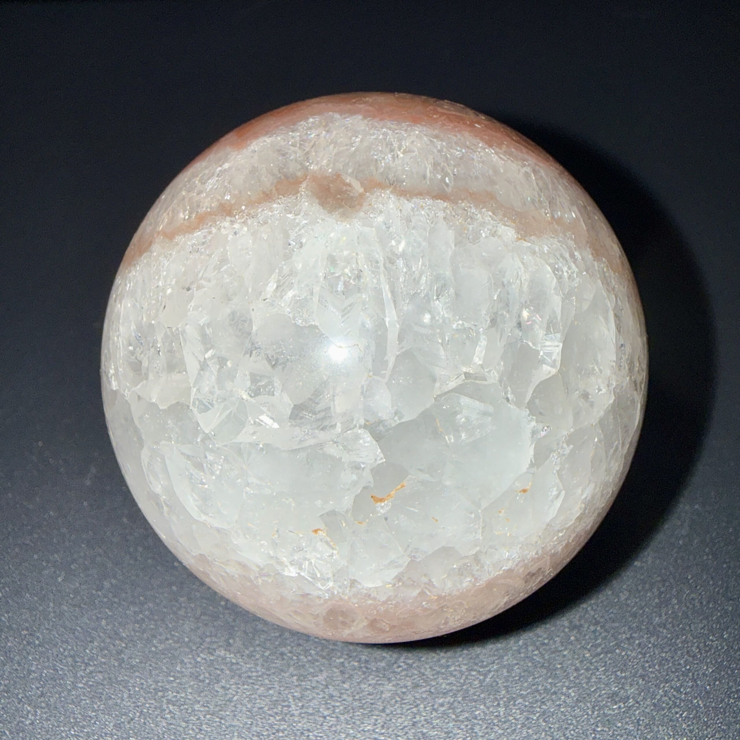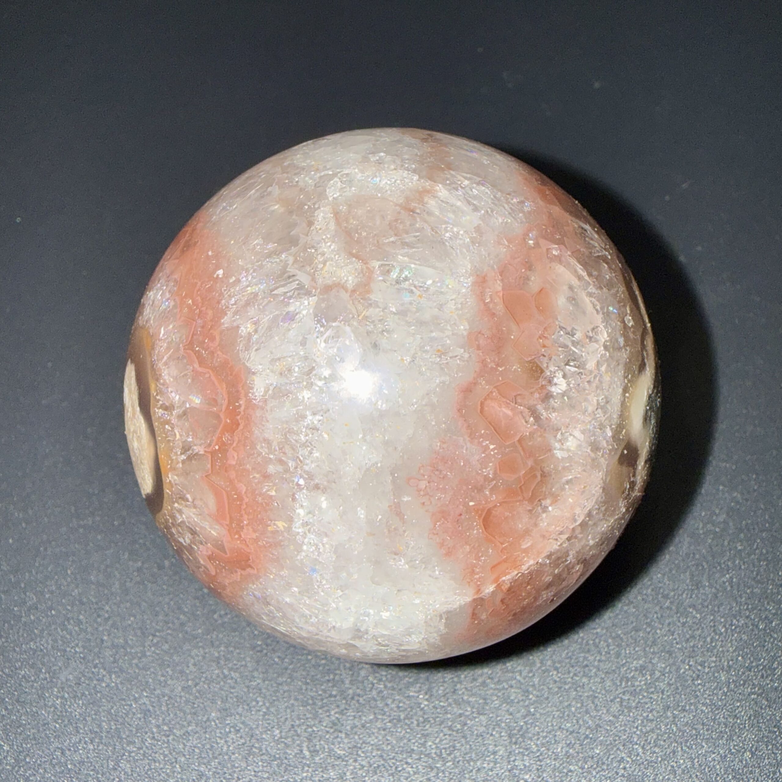 Sphère en agate crazy lace naturelle, polie pour révéler la douceur de ses nuances et la beauté de la pierre. Une pièce minérale élégante, idéale en décoration, en collection ou à offrir.