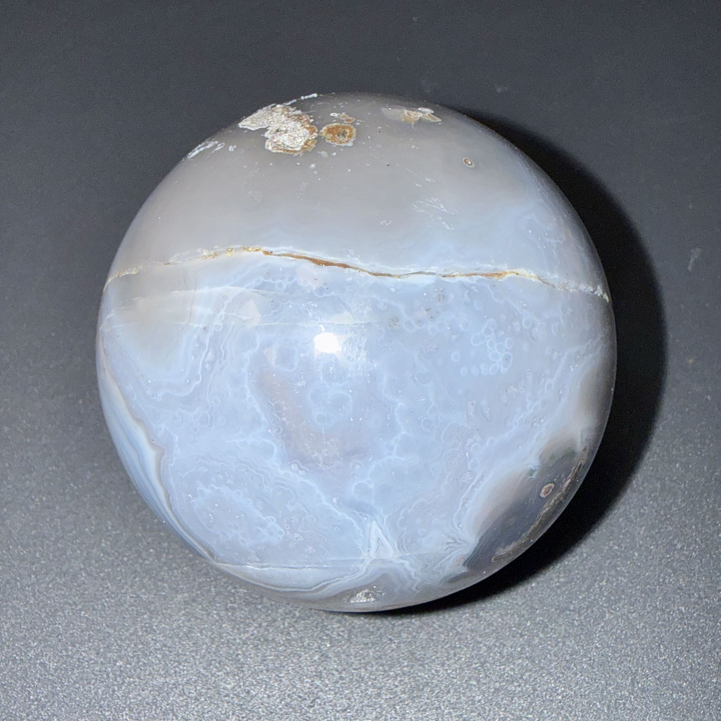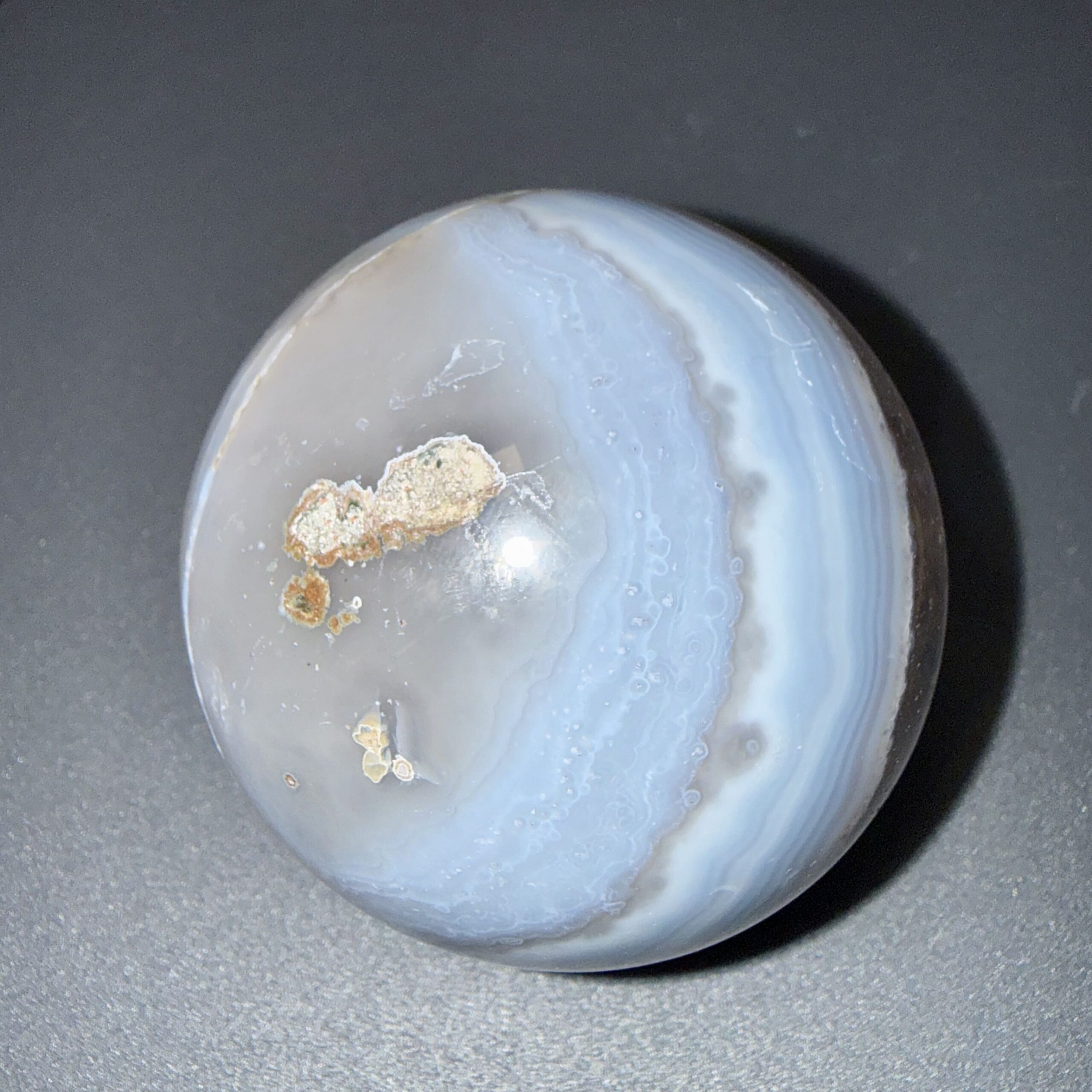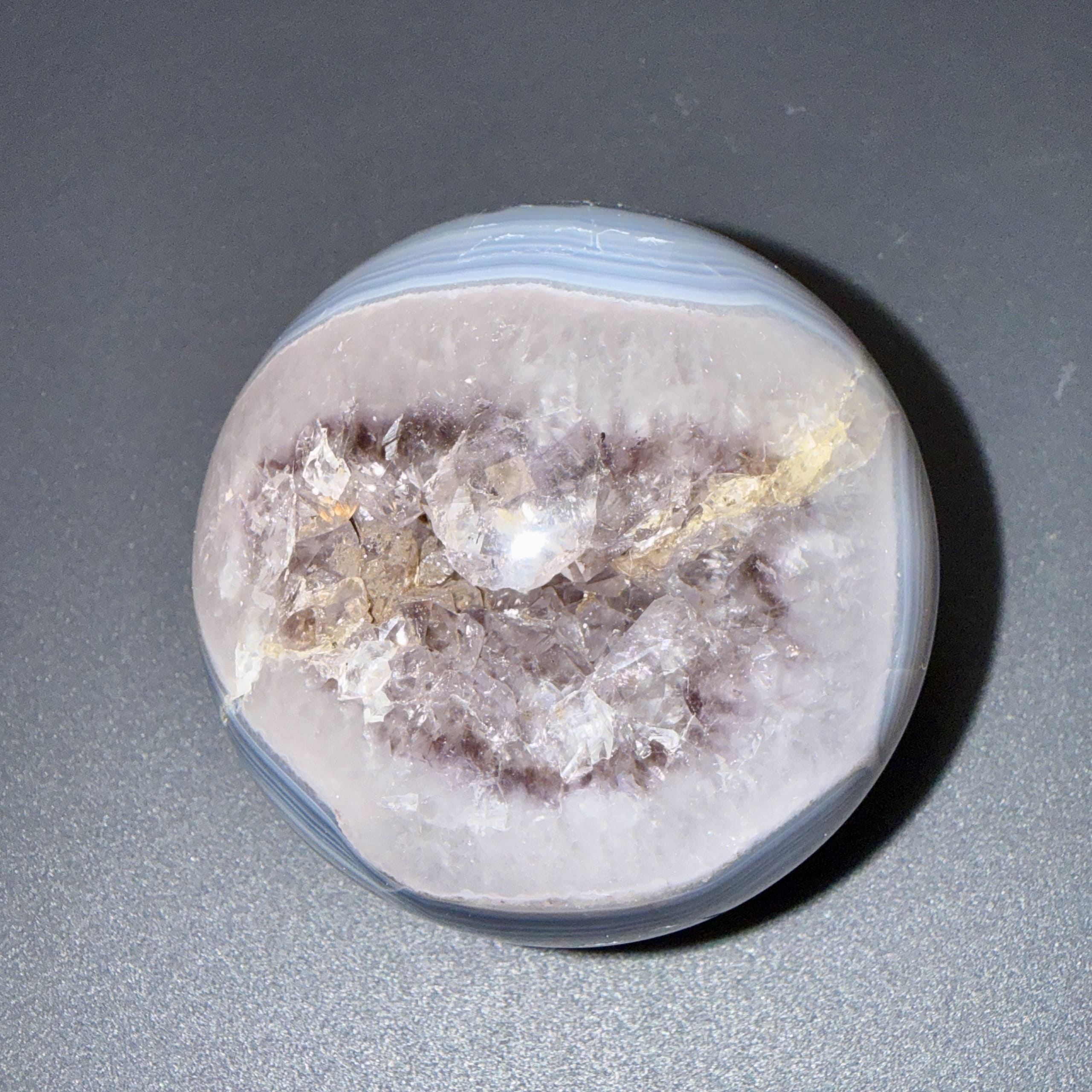 Sphère en améthyste et agate blue lace  naturelle, polie pour révéler la douceur de ses nuances et la beauté de la pierre. Une pièce minérale élégante, idéale en décoration, en collection ou à offrir.