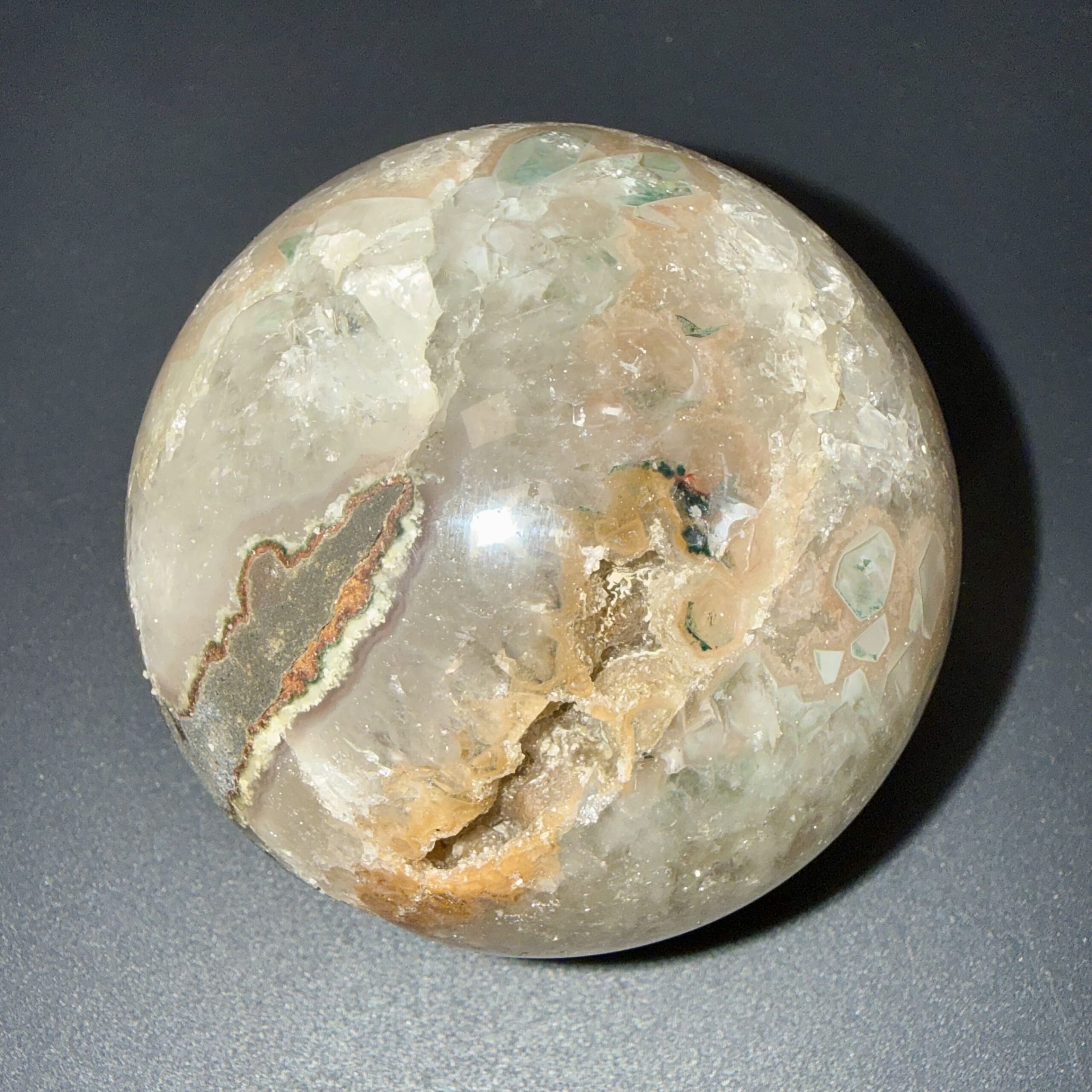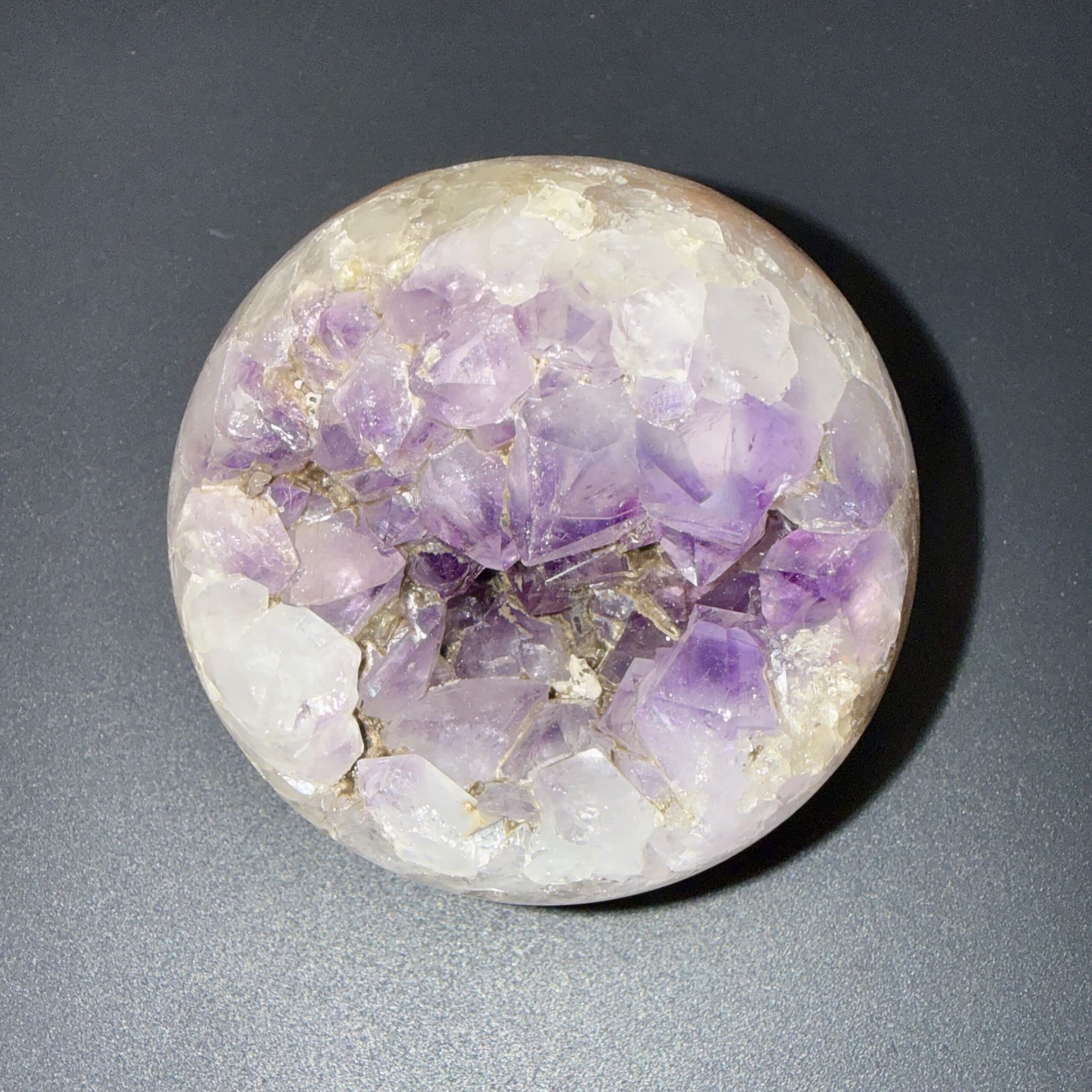 Sphère en améthyste & agate naturelle, polie pour révéler la douceur de ses nuances et la beauté de la pierre. Une pièce minérale élégante, idéale en décoration, en collection ou à offrir.