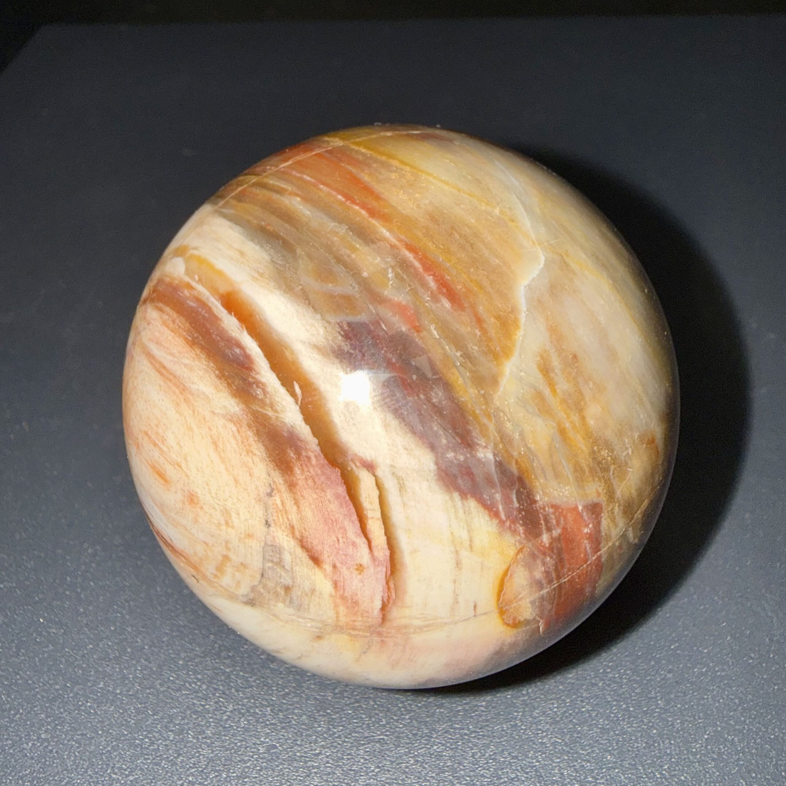 Sphère en bois fossilisé/pétrifié naturelle, polie pour révéler la douceur de ses nuances et la beauté de la pierre. Une pièce minérale élégante, idéale en décoration, en collection ou à offrir.