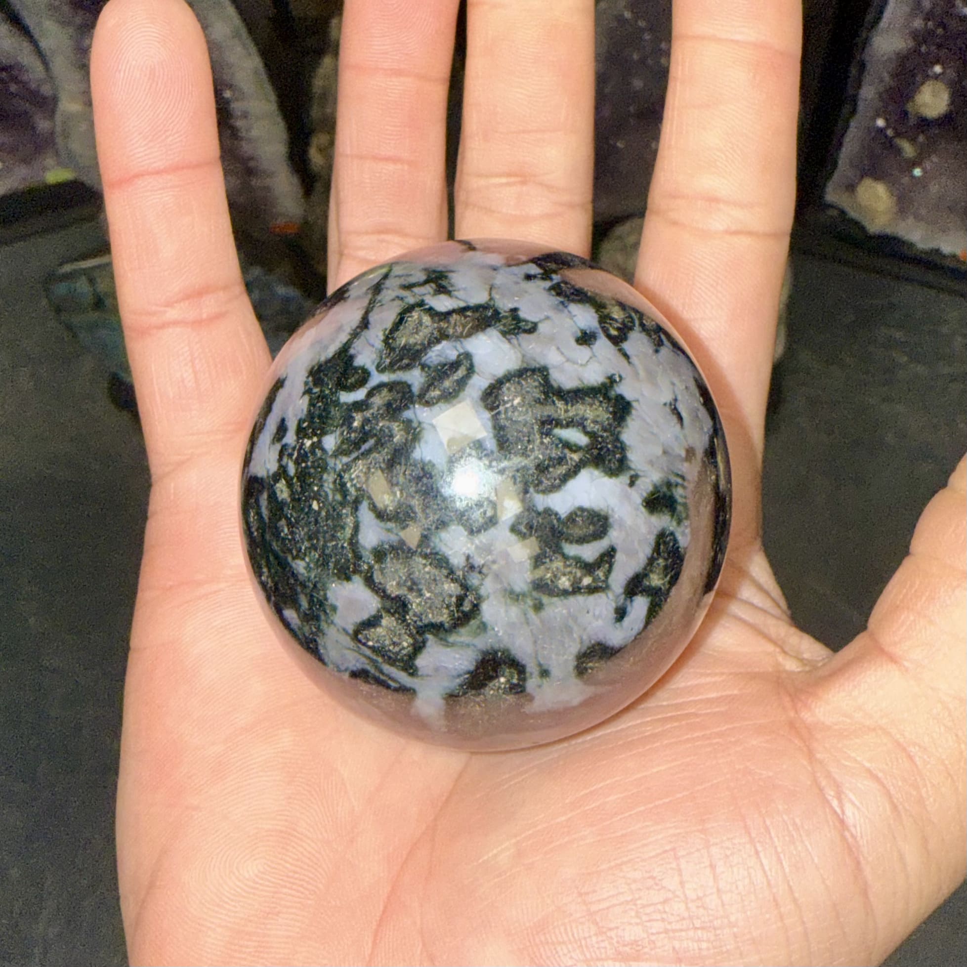 Sphère en jaspe gabbro naturelle, polie pour révéler la douceur de ses nuances et la beauté de la pierre. Une pièce minérale élégante, idéale en décoration, en collection ou à offrir.