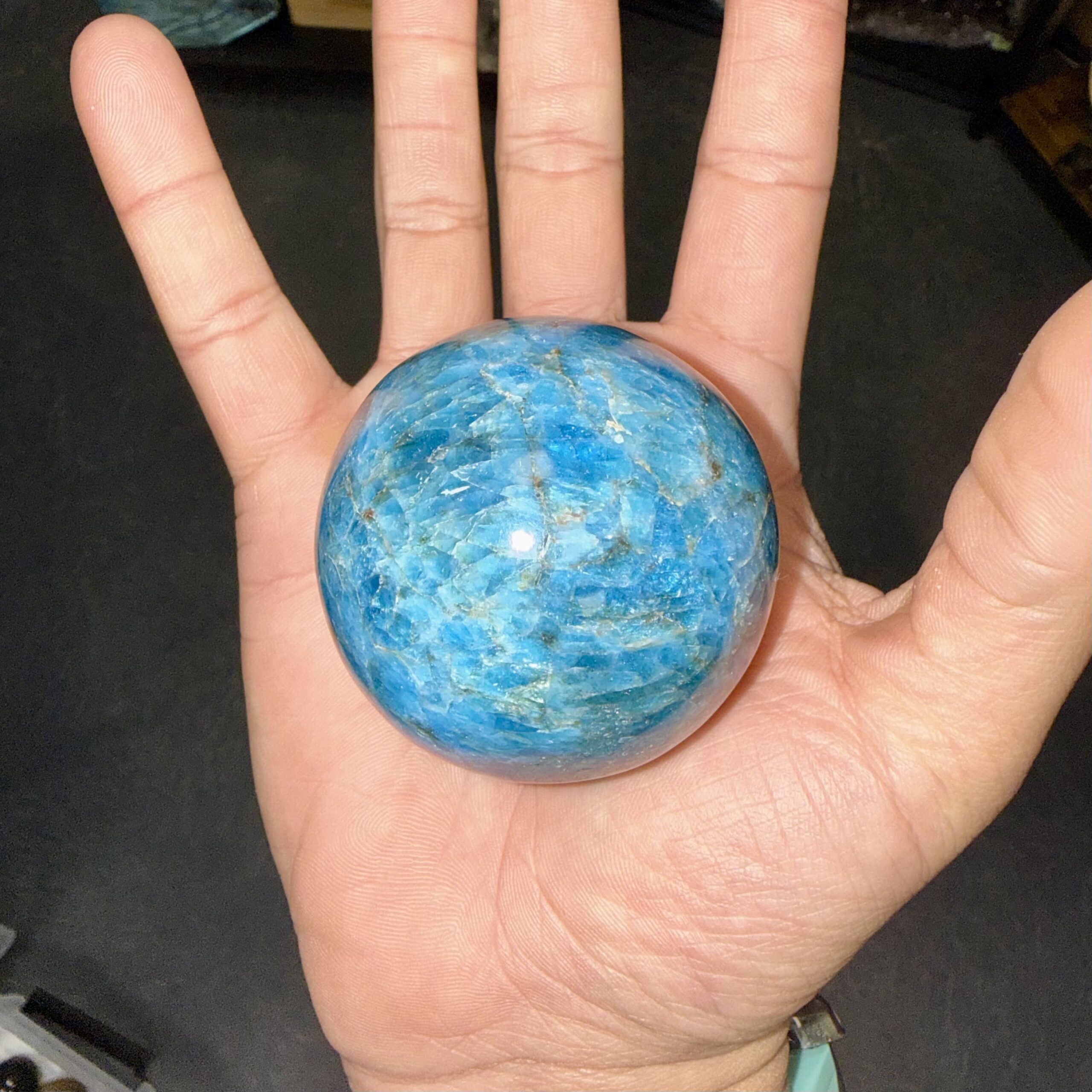 Sphère en apatite naturelle, polie pour révéler la douceur de ses nuances et la beauté de la pierre. Une pièce minérale élégante, idéale en décoration, en collection ou à offrir.
