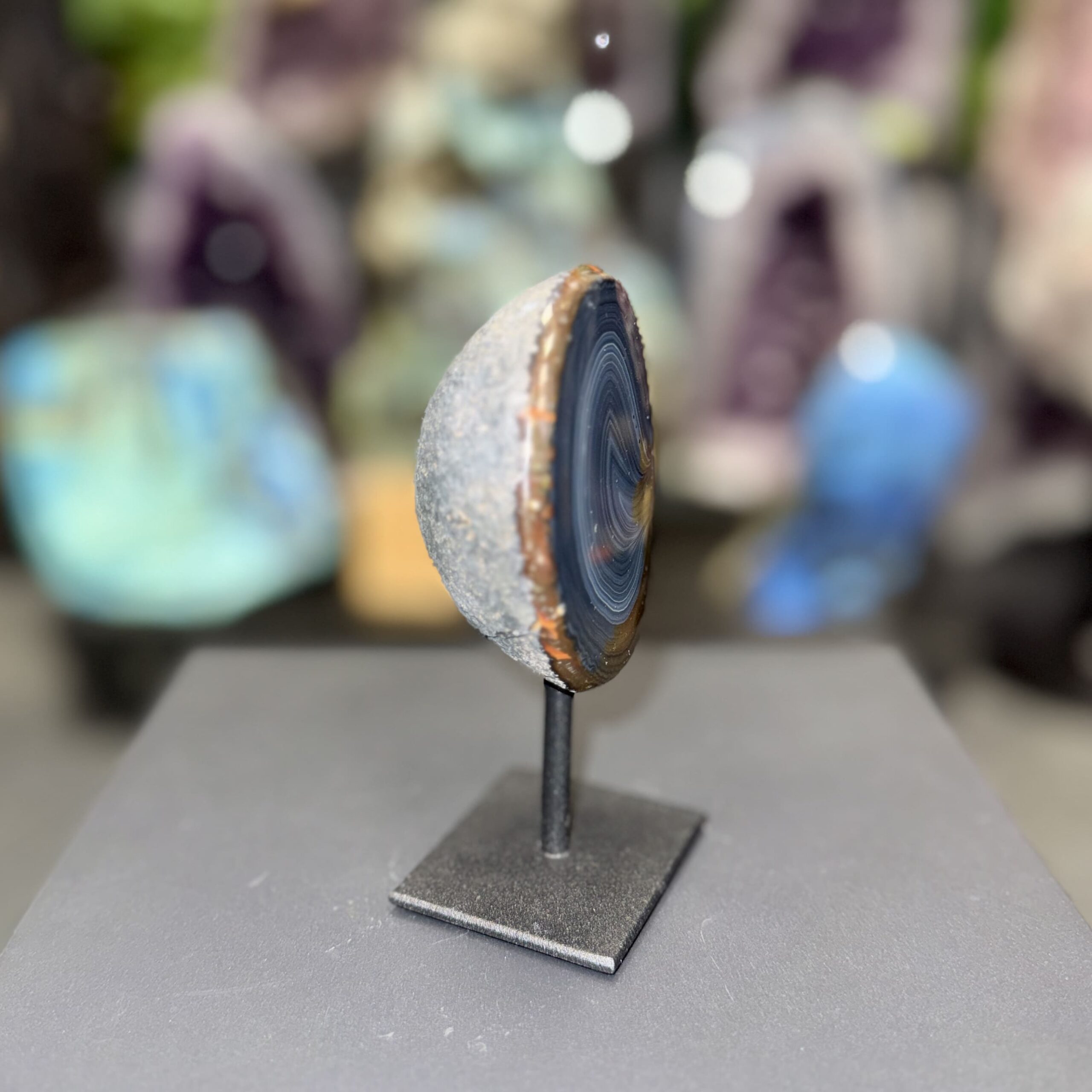 Tranche d’agate naturelle présentée sur socle, polie pour révéler la finesse de ses dessins et ses nuances concentriques. Une pièce décorative minérale élégante, idéale pour une étagère, un bureau ou une collection.